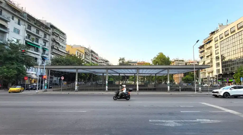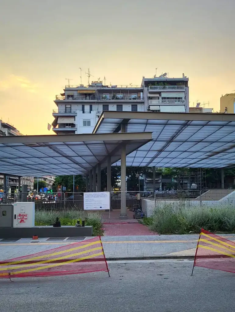 Ακριβώς απέναντι, στη βόρεια είσοδο του μετρό, το στέγαστρο – μήλον της έριδος. Το γιγαντιαίο στέγαστρο που σκοπό θα έχει την προστασία των αρχαιοτήτων που βρέθηκαν στην πλατεία, του οποίου η ανέγερση είχε εγείρει αντιδράσεις για διάφορους λόγους, όπως η κοπή πολλών δέντρων του πάρκου και η τσιμεντοποίηση αυτού, το ξήλωμα παιδικής χαράς και η προβληματική συνύπαρξη με τον προστατευμένο από την UNESCO ναό της Αχειροποιήτου.