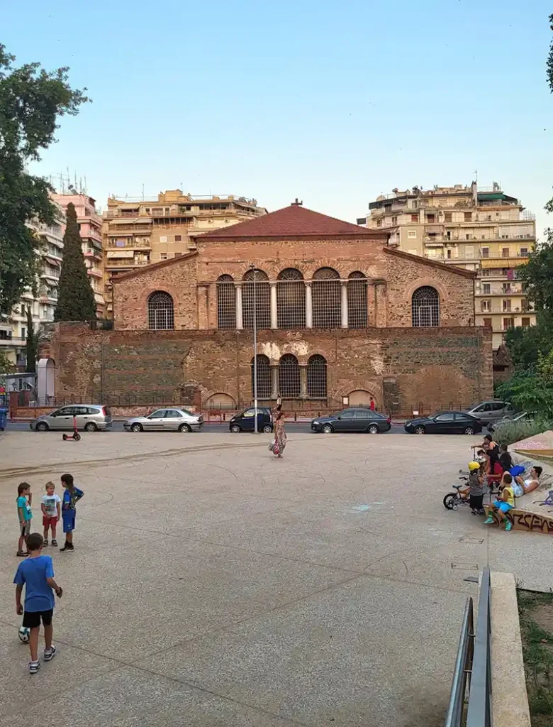 Παιδιά παίζουν μπάλα υπό το «βλέμμα» των παραταγμένων Μακεδονομάχων και απέναντι από τον επιβλητικό ναό της Αχειροποιήτου σε μια, έστω και έμμεση, εξοικείωση με τη βυζαντινή αρχιτεκτονική.